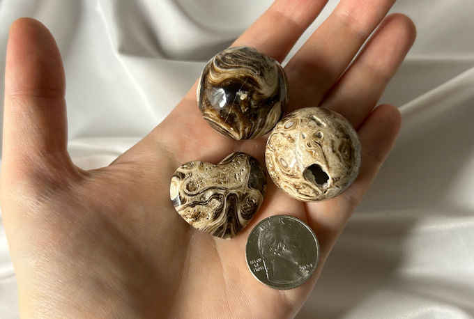 Chocolate Calcite otherwise known as brown aragonite forms in masses and is alternating with calcite, giving it the beautiful layering you see here. Associated with the root chakra, it is a powerful stone for balance, protection, confidence, growth, and focus. Elevate your spiritual journey with a touch of elegance and harness its profound energies. Shop now and experience our commitment to bringing you the finest gems and stones.